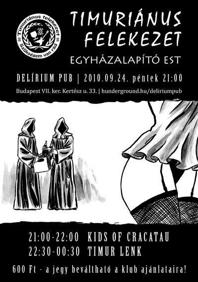 A szegedi underground rockélet örökzöld komédiása, a Timur Lenk zenekar eljő a fővárosba, hogy megalapítsa saját egyházát! Ebben asszisztál őnéki a Kids Of Cracatau legénysége, s leánysága. S megszületik vala a Timuriánus Egyház !