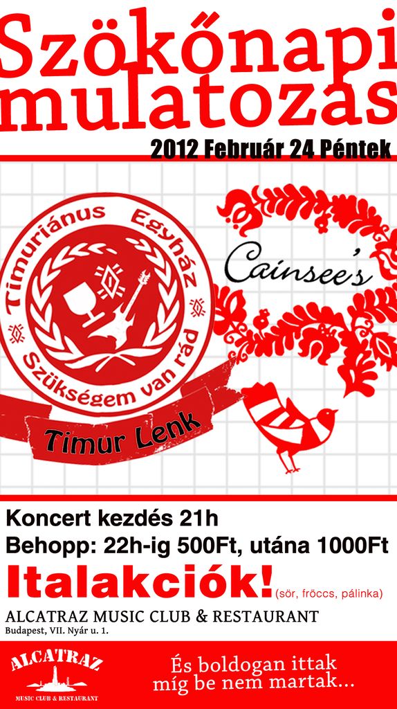 2012. 06. 08. Sajnos az egyház ügyében későn kezdtünk el lépni, úgyhogy ez már csak szép emlék marad, de újrakezdjük civil szervezetként, egyelőre annak a vizsgálatánál tartunk, hogy "Timuriánus Egyház" néven lehet-e civil szervezetet létrehozni, vagy valami obskúrus szabály ezt nem teszi lehetővé. Ez utóbbi esetre a "Timuriánus Kettőnekafelelakóépület" névvel készülünk, hátha ez már átcsúszik. Persze lehet, hogy a még furmányosabb "Timuriánus Abszolútérték Mínusz Gyökkettő Négyzet Mínusz Egy Plusz A Fogócskában Az A Hely, Ahol Nem Ér" Civil Szervezet leszünk, de ez a végső mentsvár. 2012. 04. 29. A szegedi rocktörténet két óriása, a Timur Lenk és a Tirke Honolulu ezúttal Budapesten ad találkozót egymásnak. A szívélyes légkörű összejövetelre MÁJUS 4-én PÉNTEKen a TRAFIK KLUBban (Bp. VIII. Mikszáth tér 2) kerül sor. 2012. 03. 26. Újfent itt az alkalom, hogy a hétköznapok iszapos gletyója által ocsmondán betrutymózott lelkeiketeket felemeljétek a Magasságos És Transzcendens Lényhez, valamint hogy megfelelő mennyiségű alkohollal kipárnázva meglágyult butyurdákos agytekervényeiteket befogadjátok a Nagy Timur Szent, Satuként Lefogott Á-Moll, Valamint Az Általa Ismert És Használt Másik Kettő Akkord Zenei Kinyilatkoztatásait! Hely: Gozsdu Manó Klub (Gozsdu Udvar) Idő: március 30, péntek este 21:30 Belépő: 600 HUF Normális zene utánunk, lemezről: PorcaMiseria Emeljétek fel lelkeiteket a Nagy Timurhóóóóz!!!! 2012. 02. 20. A bajusz hónapja kötelez: február 24-én, pénteken a Timur Lenk történetének első funky(s) próbálkozásait láthatjátok. Az Apaszentegyház letisztult gondolatokkal ugrik neki a megfáradt, negyvenöt éves műfaj megújításának, és reméli, hogy az Egyház megírt sorsa, miszerint kevés gyakorlással kell nagyot alkotni, újra maradéktalanul beteljesül, és jól is esik majd. Tekintettel az idő rövidségére négy kategóriában fogadunk el nevezéseket: A zsűri (a zenekar) kategóriánként oszt díjat, a díjakról, és a nevezés részleteiről többet a helyszínen! A helyszín pedig a Blahánál található Alcatraz nevű patinás szórakozóhely (Bp.VII. Nyár u. 1.), Előttünk a fantasztikus nőtagokkal valamint elképesztő hímtagokkal fellépő, szintén nagyon funky CAINSEE'S: http://www.youtube.com/watch?v=YjbbcrgYelg&feature=youtube_gdata_player Kezdés: 21:00. Belépő: 22 óráig 500 HUF, utána 1000 HUF Utánunk DJ Taxibanutazóbaltásgyilkos gondoskodik a felhőtlen hangulatról. Mottónk pedig ezúttal komoly költemény:) Péntek Esti Elégia RTL-es Való Szarba' 2012. 02. 15. A korukat megelőző művészek örök igazsága rejlik a viccben, amikor a '920-as években két unott orosz emigráns művész unottan beszélget egy párizsi kávézóban: A február 24.-i Alcatrazos koncertnek meg itt a plakátja: 2012. 02. 02. A Timur Lenk zenekarral épp abban mesterkedünk, hogy idén nyáron végre megmutassuk tanainkat és halhatatlan művészetünket szélesebb körben is, néhány fesztiválon! Megy a lobbitevékenység 1000-rel, és hozzáértő emberek azt tanácsolták, hogy sürgősen maximalizáljuk a fészbukkos lájkolóink számát. Ugyanis ez -bár szerintünk lószaft se jelent- a döntnököknek állítólag fontos mutató. Cél az 1000 lájk!!!!! Spameket, körleveleket nem küldünk, mert ezeket mi is utáljuk meg rohadt lusták is vagyunk! Addig is a Metálsas szarnyaljon Veletek! És a te lelkeddel, Enter. 2012. 01. 30. : DDDD 2012. 01. 24. Ne feledjétek hitünk szent titkát, timuriánus gyónás és szentáldozás PÉNTEK ESTE 21 ÓRÁTÓL A SZABADAZÁ-BAN!!! (VII. Nagydiófa u. 8, Grandió-pince) Sör-pina-rakkendroll áldozat bemutatása. Valamint meglepetés-vendég: MAGNA CUM LAUDE* * folyékony formában :) ESZETLEN MULACCSÁG LESZ, HÖ! In eternum, enter. 2012. 01. 10. A résztvevőknek biztonsági okokból kötelező belépni a Szabadazá Kulturális Egyesületbe. A tagdíj 500 HUF.