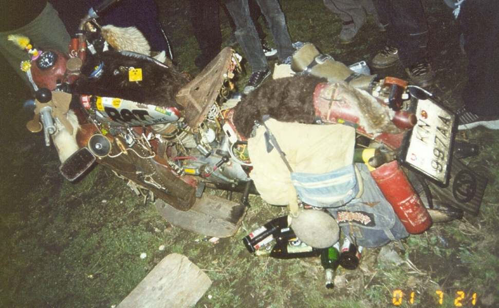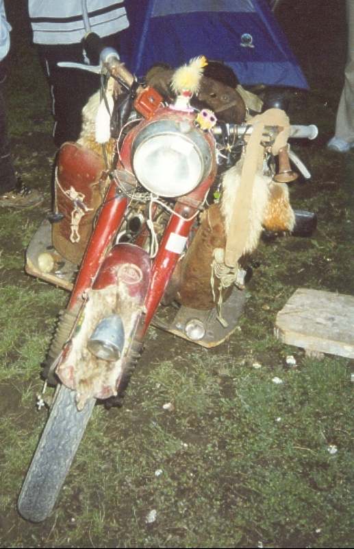 - Kormányszarvon rókafarkak, öngyújtótasak, nejlonharisnya, pumpás duda.